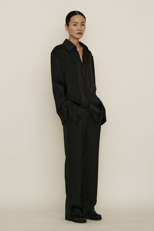BLACK SATIN RAW EDGE BLAZER SHIRT
