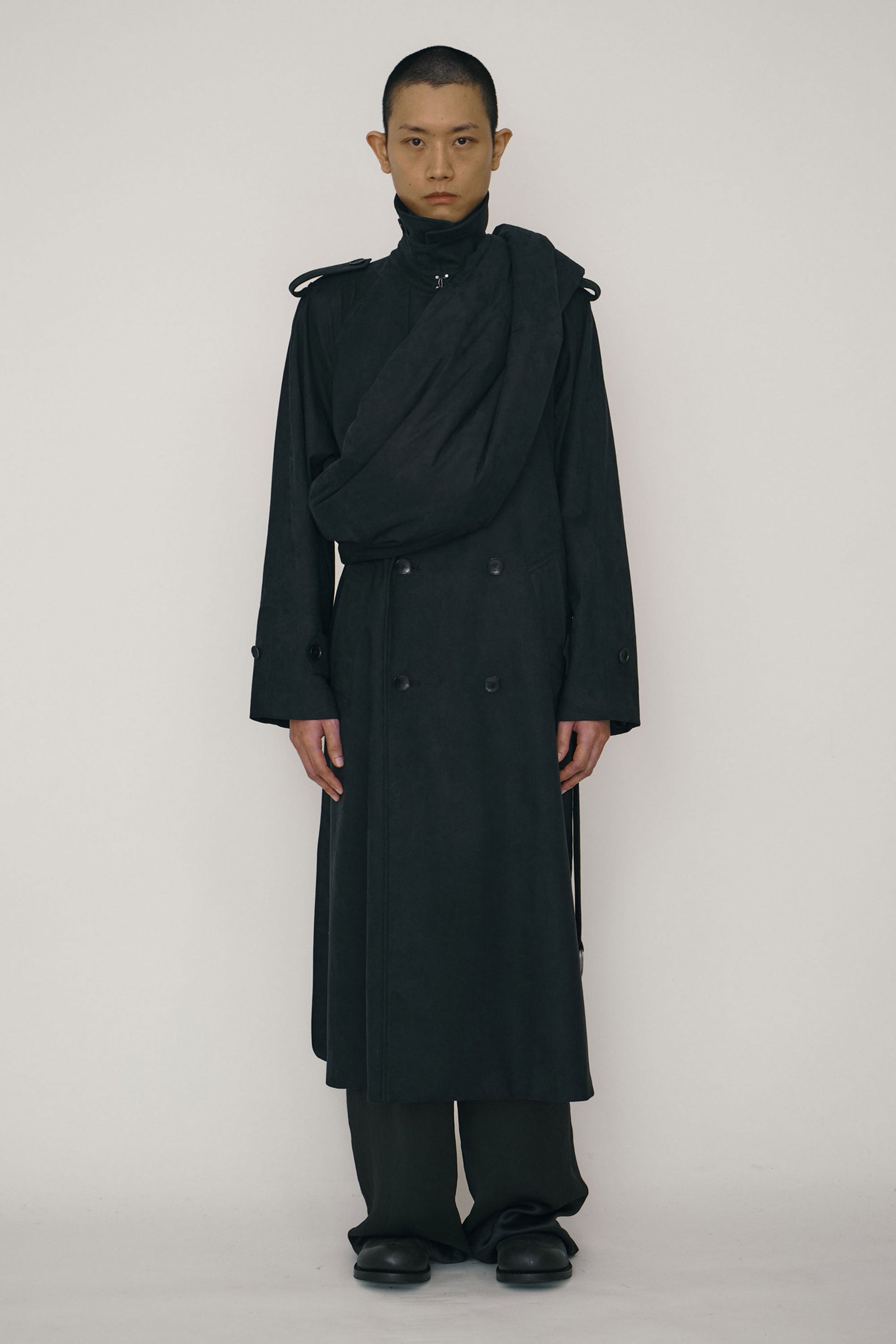 BLACK FAUX-SUEDE DOUBLE-BREASTED RAGLAN TRENCH COAT