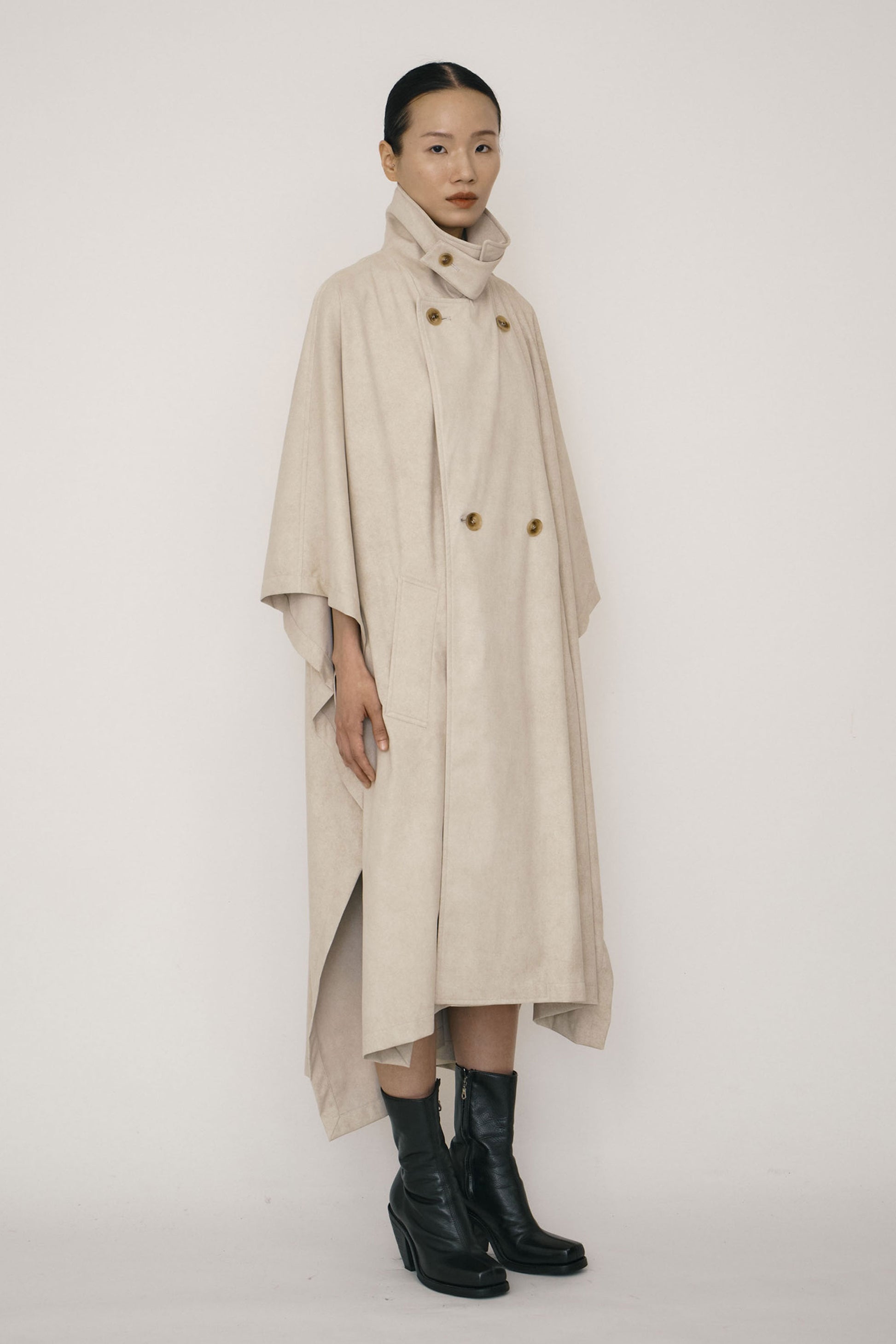 KHAKI FAUX-SUEDE DOUBLE-BREASTED CAPE (MADE TO ORDER)