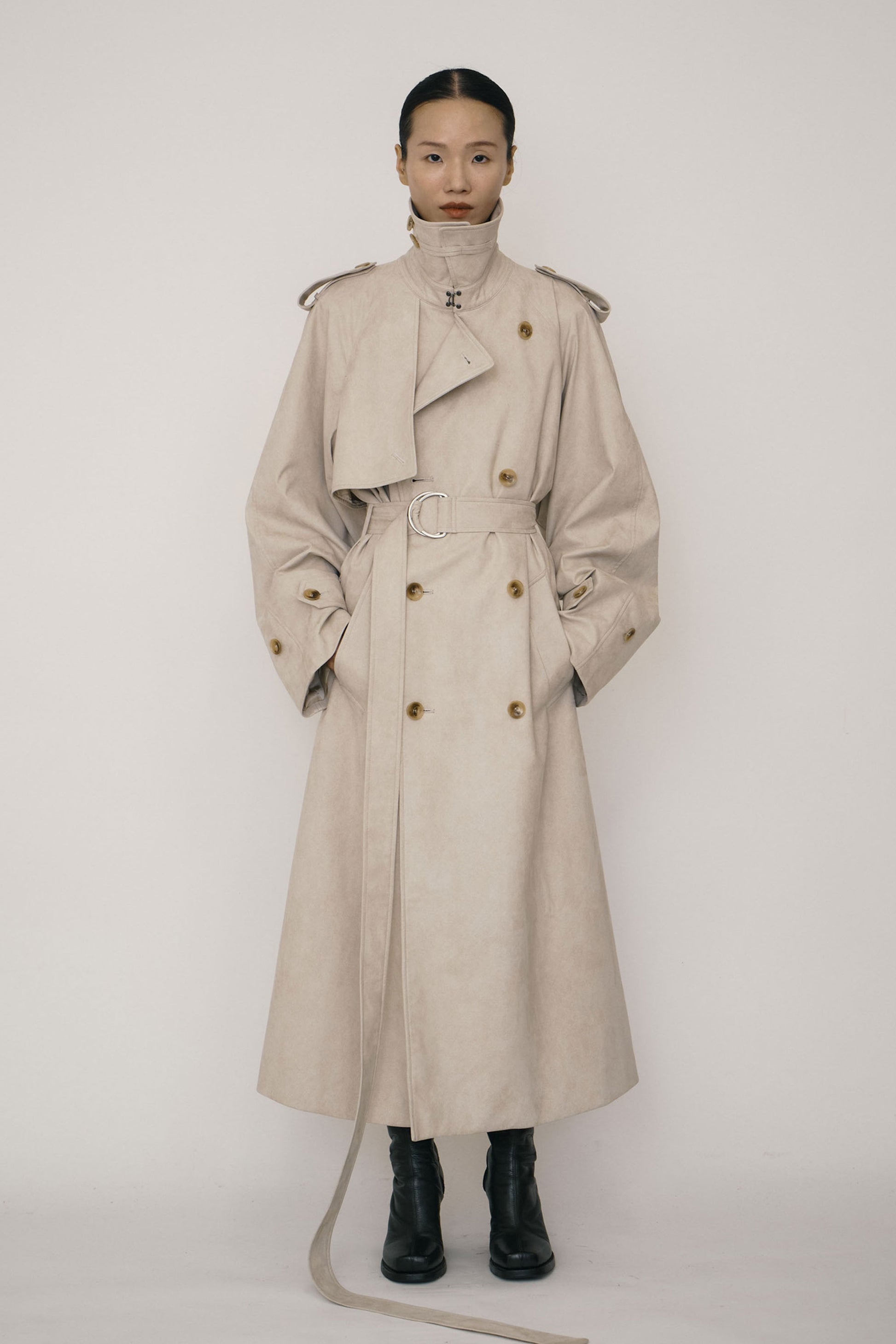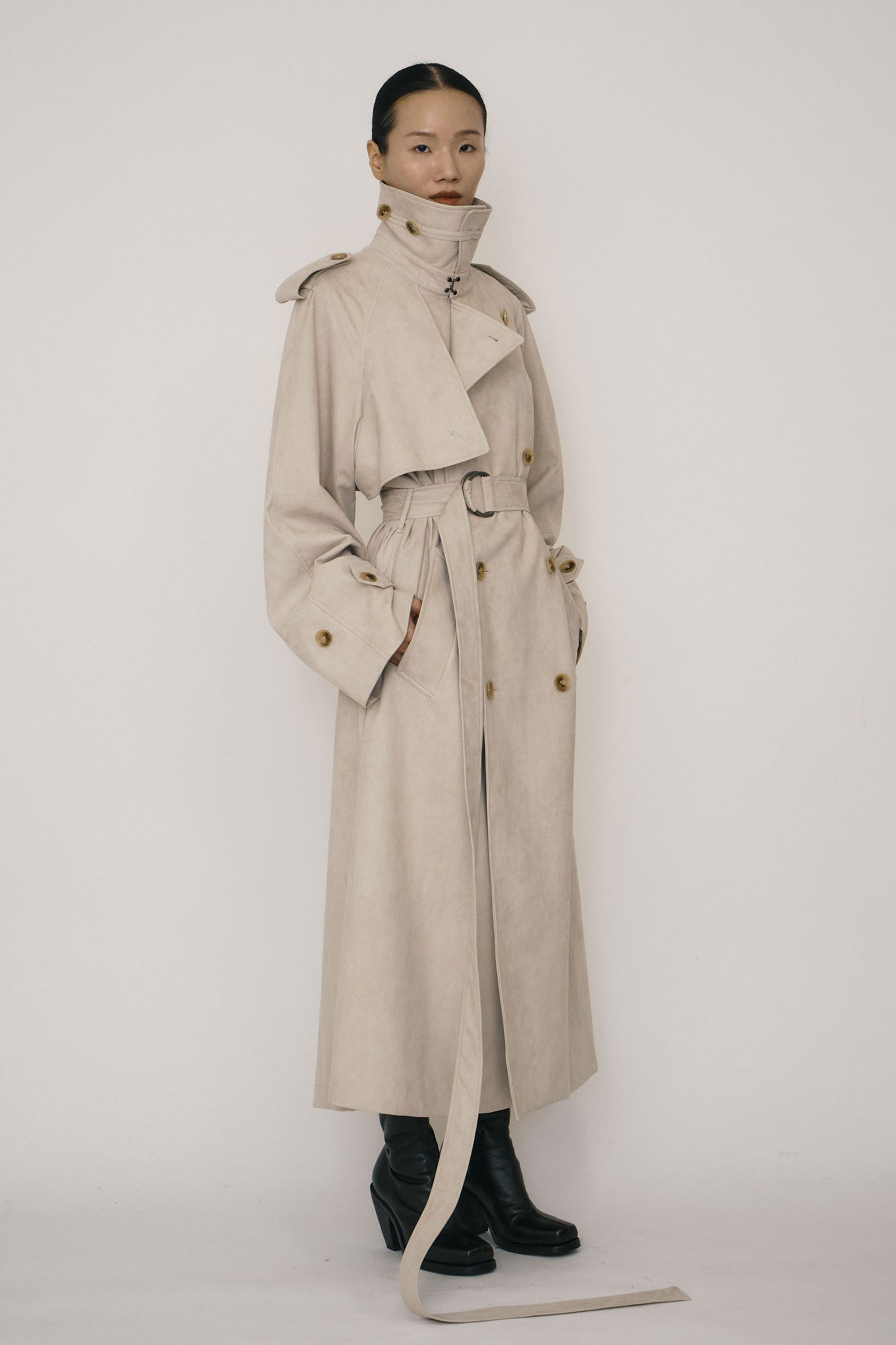 KHAKI FAUX-SUEDE DOUBLE-BREASTED RAGLAN TRENCH COAT (MADE TO ORDER)