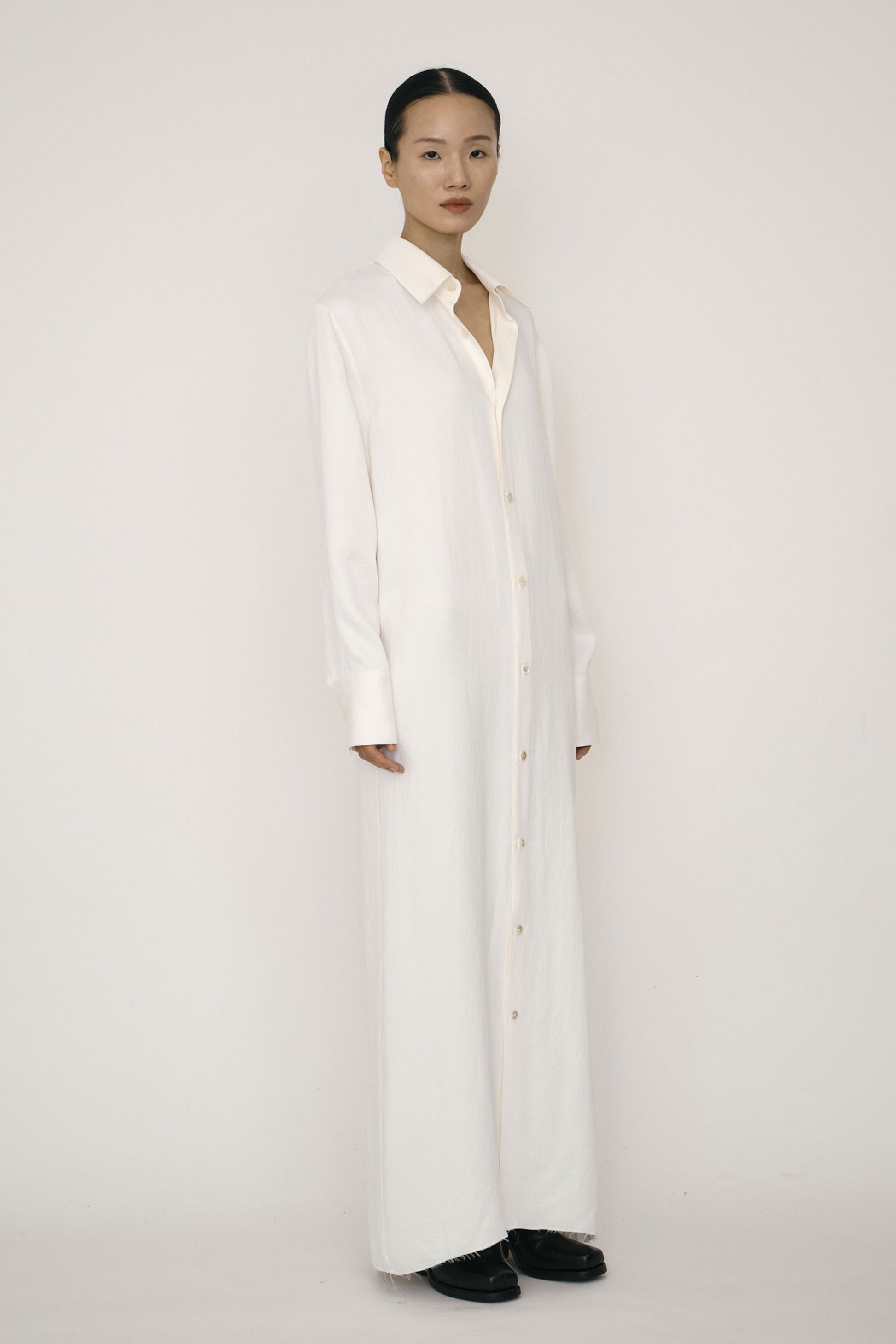 WHITE SATIN RAW EDGE SHIRT DRESS