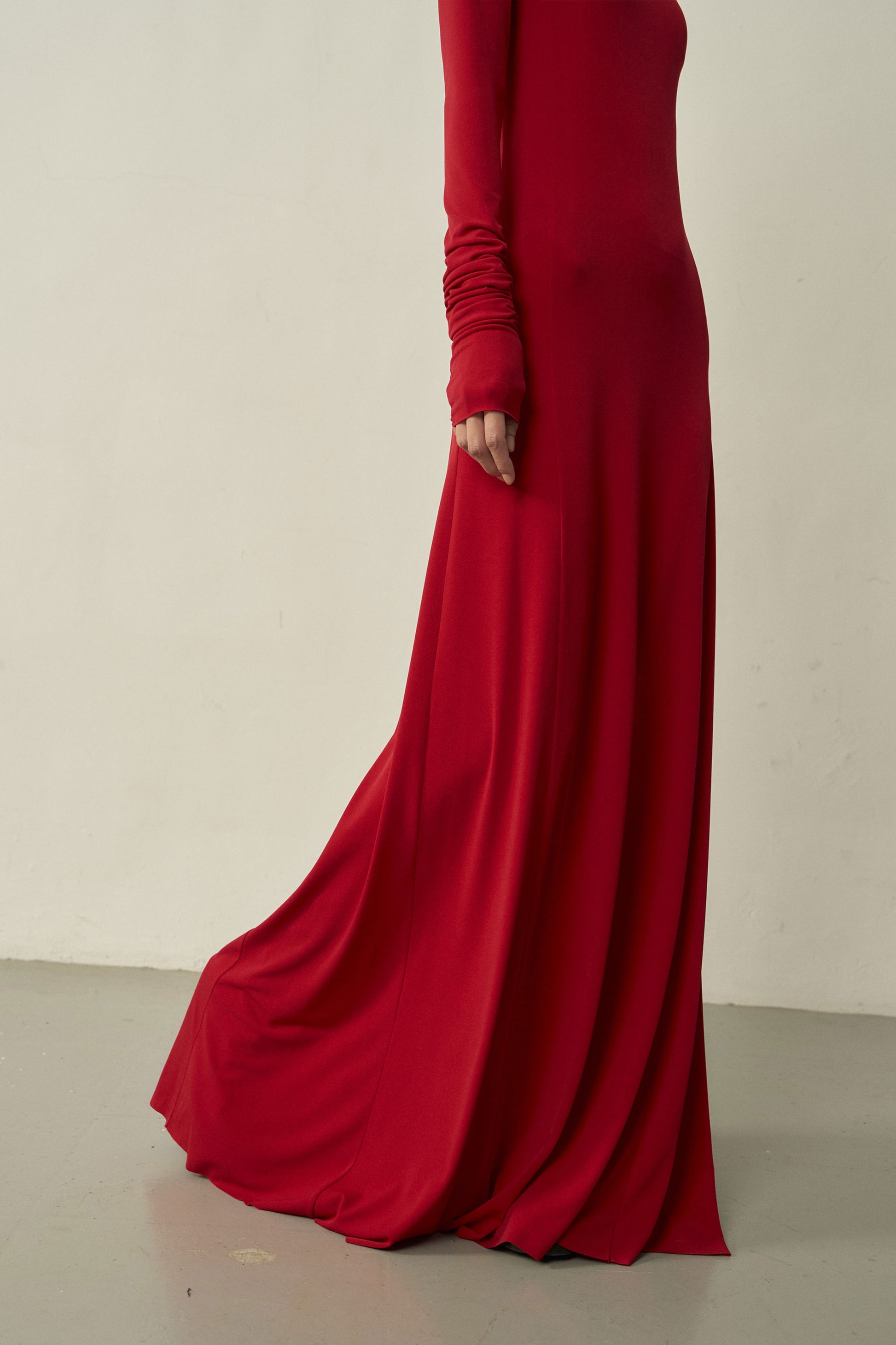 RED LONG-SLEEVE HIGH NECK SKINNY MAXI FLARED DRESS
